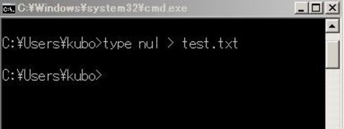 Windowsのコマンドプロンプトで、ファイルを新規作成するコマンドがなかった。 そこで解決方法を考えた。 C:\> echo a > test.txtこれでtest.txtファイルが作られる。 でも"a"という文字が入ってる。それを気にしなければOK。 ちなみに、文字を何も指定しな…